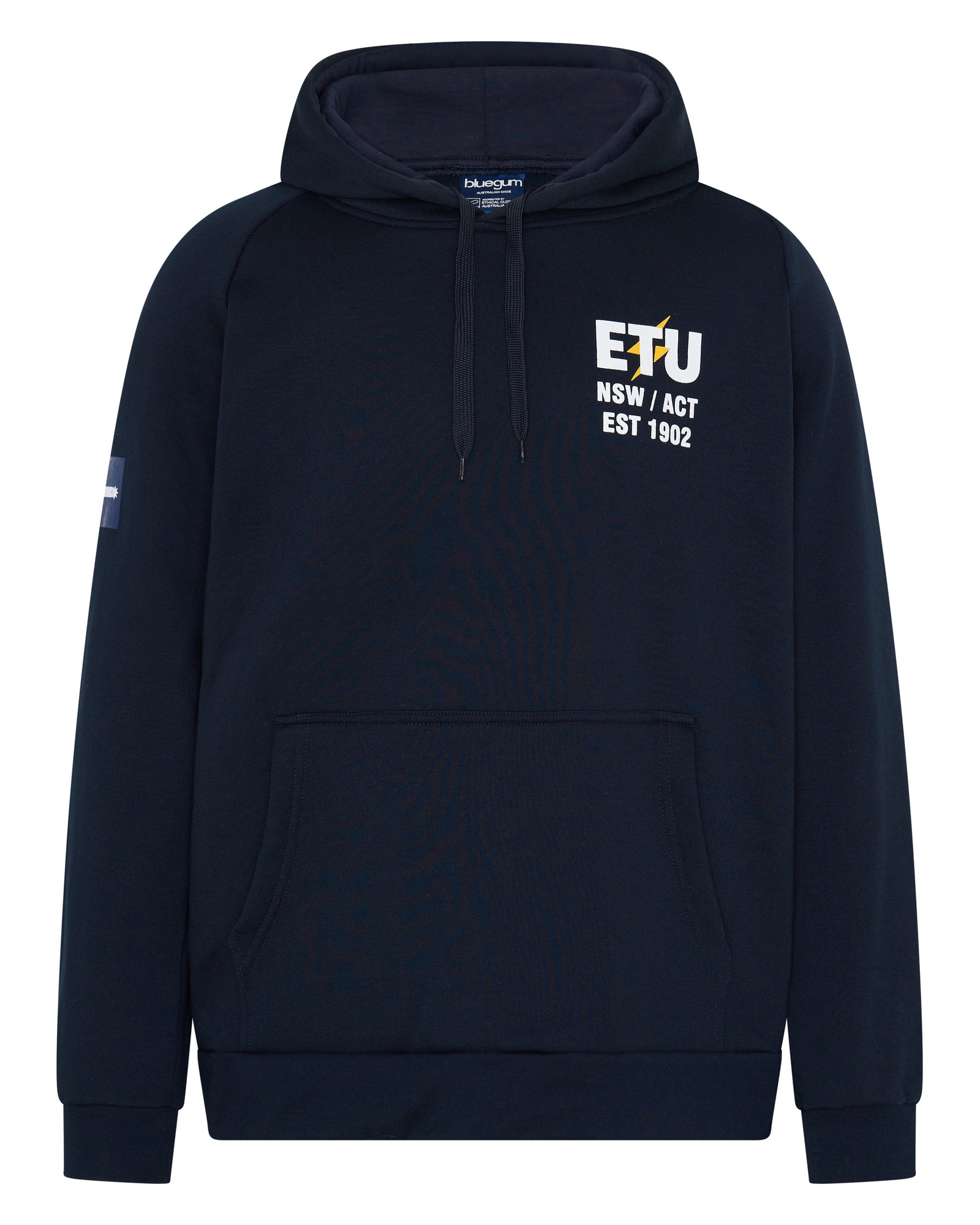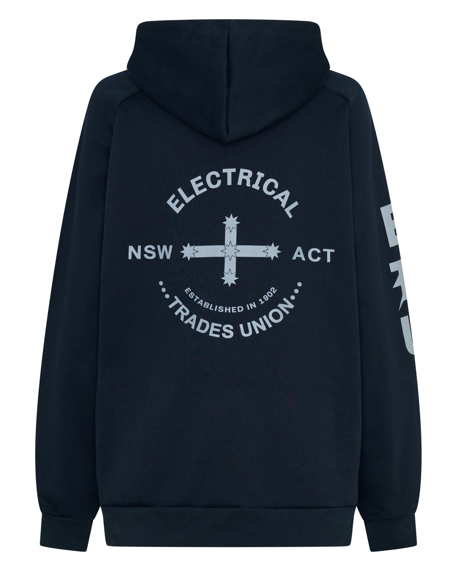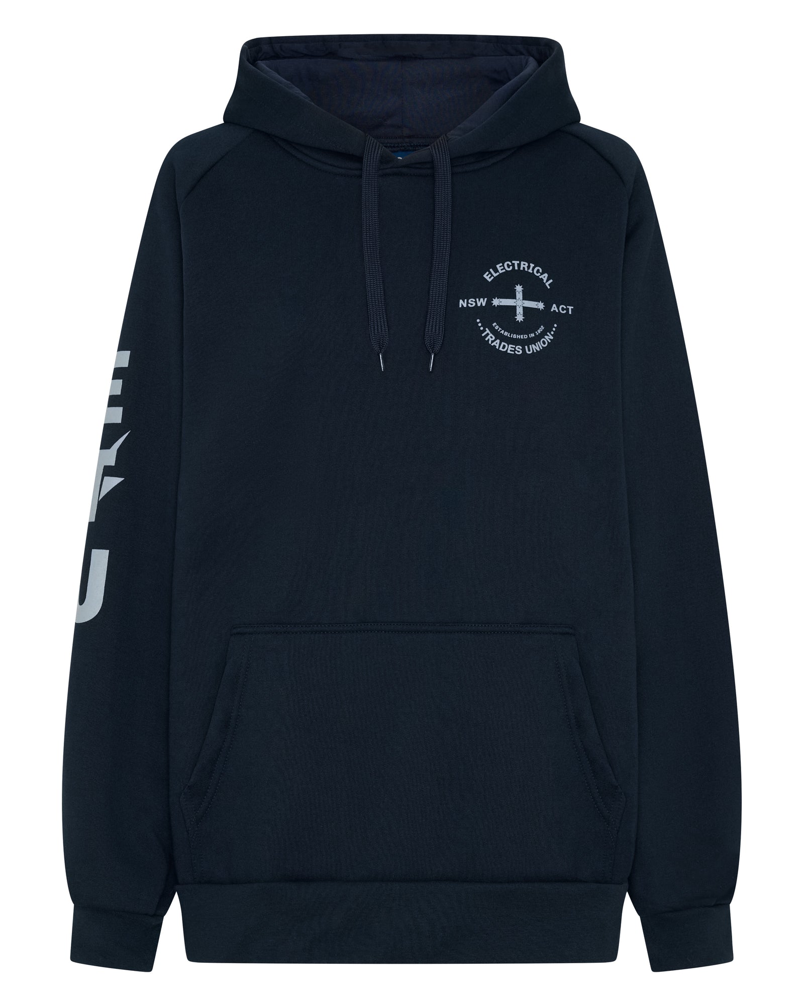Keep warm with this ETU Eureka hoodie. Proudly displays Eureka Cross Union logo in midnight blue. An ETU staple to keep you warm on site or at home. Union-made, Aussie-made, always.